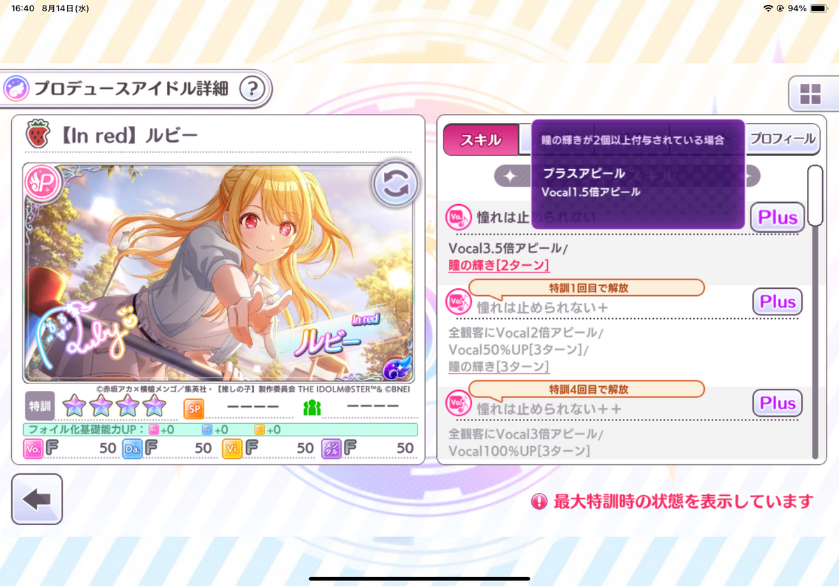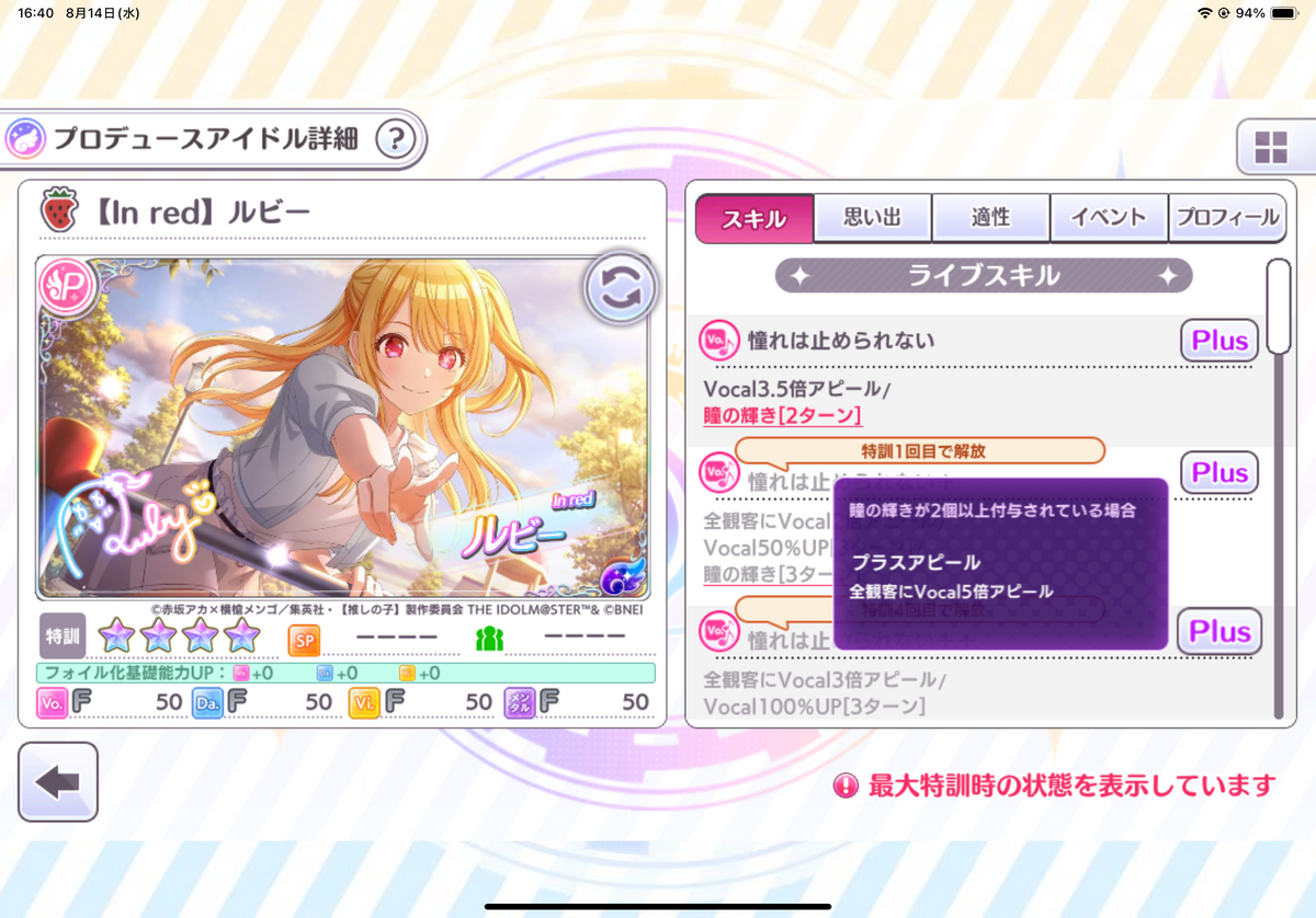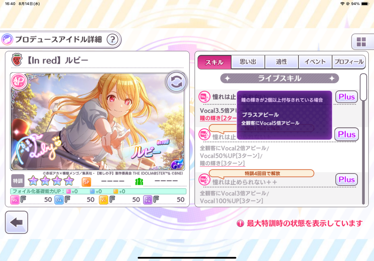一点注意点として、Plusアピールの「瞳の輝きが2つ以上」は、ターンの開始時点で条件を満たしている必要があります。