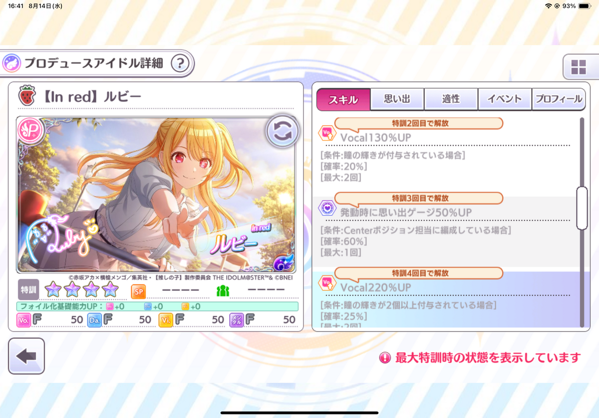これまでの限定ルビー/かな/MEMちょ同様にB小町でのLink要素は一切なく、単体運用前提の性能です。その上で全体8倍アピールは十分主砲にできる火力かなと思います。