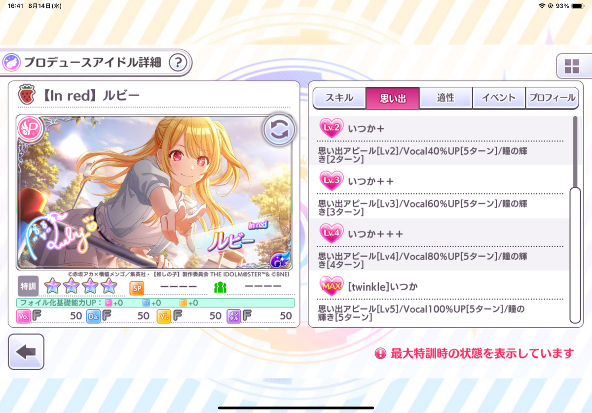 あとは自分のアピールで削り切ってしまわないようにひたすらメンタルキュアでもして思い出が溜まるのを待ちます。