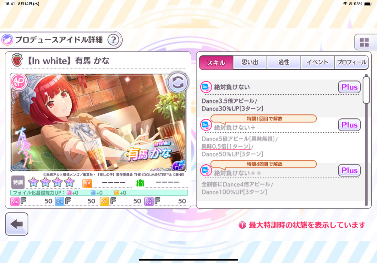 有馬さんの名誉のために補足しておくと性能的には普通に強いと思います。特に実質無条件で発動でき、Meを40%削れるPlusアピールは【一夏・泡沫・ギフテッド】結華の虹バフを発火できるので、かな単体でメインを張るというよりは既存のDa編成にさしておくといい仕事をしてくれる、といった感じになるんじゃないでしょうか。