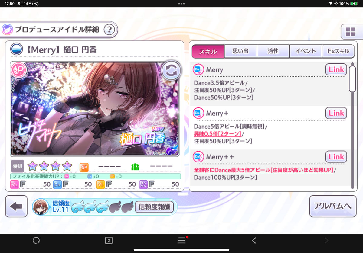 これ何が難しいかっていうと、低グレード帯ほど審査員の体力が少ないため思い出を撃つ前に一瞬で帰っていきます。ひどいと自分やライバルのスキル1枚目で10割削られて即帰宅します。