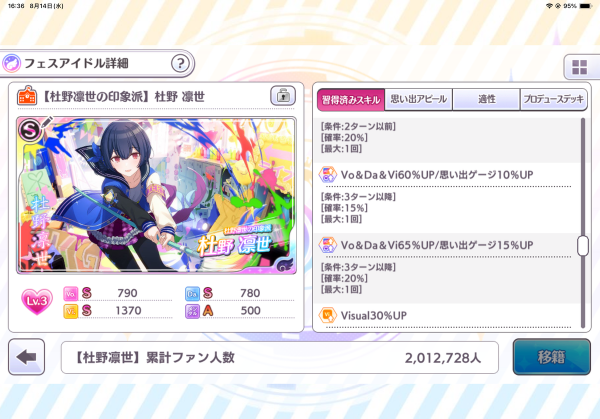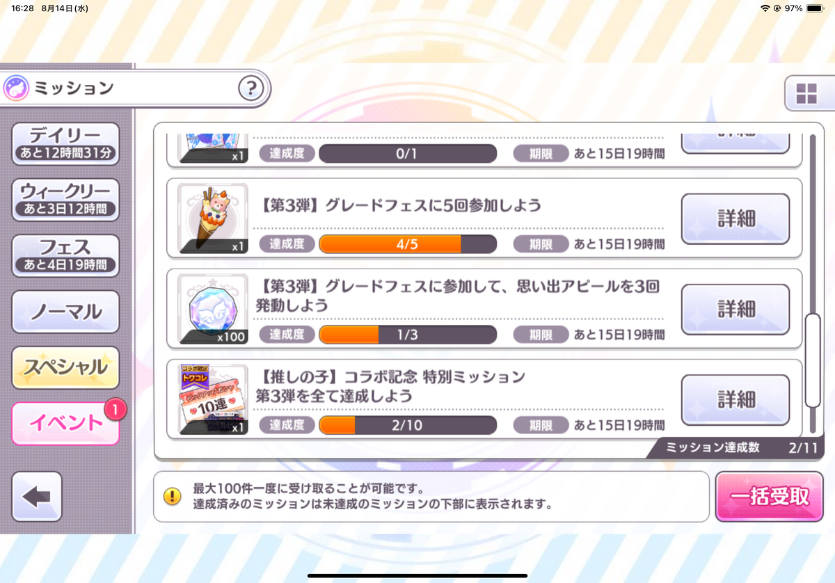 スペースが余ったのでトワコレとは関係無いですが、シャニマス最難関ミッションの一角こと「グレードフェスに参加して思い出アピールを◯回発動しよう」について触れておきます。