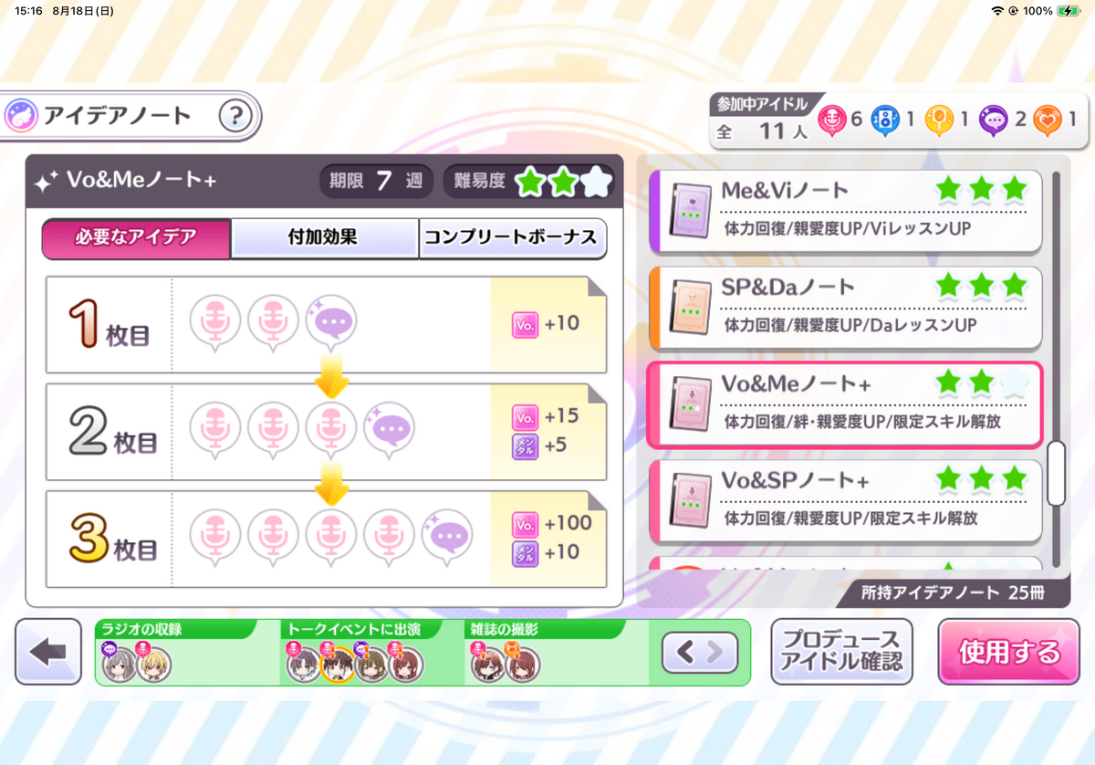 リハーサル後などに入手できる+付きのノートは必要アイディアが尖っていて特定のステータスをより特化して育成できる強力なノートです。