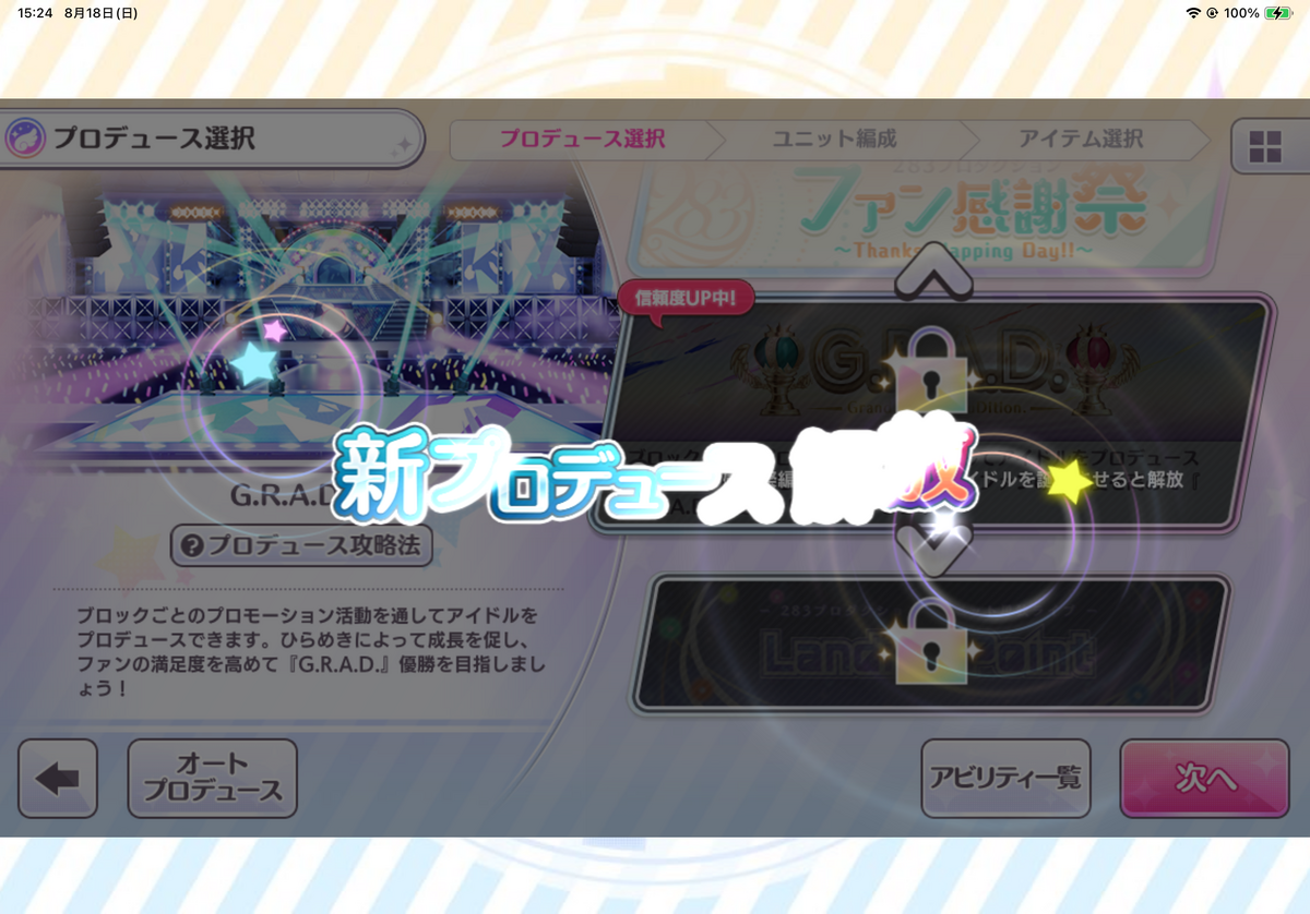 特にGRAD/LPはオートプロデュースでノウハウ掘ったりEX掘ったりにも使うと思うのでこの辺で解放しておきたいですね。