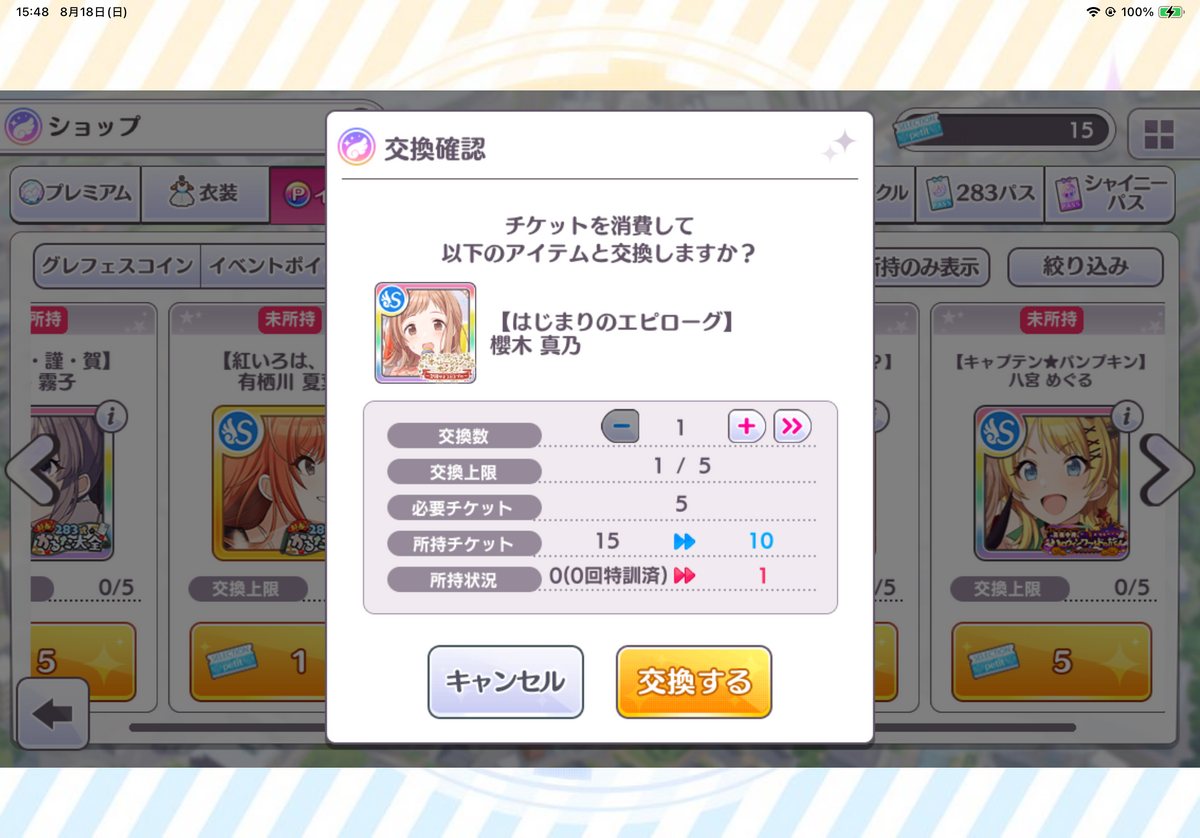 ちなみにプチセレクションチケットは開催中のイベントをだいたいこなすと(確か)5枚貰えます。自分は推しの子復刻/新推しの子/円香の箱イベの3種類で計15枚持ってたのかな。次回か次次回には完凸できるので楽しみ〜。