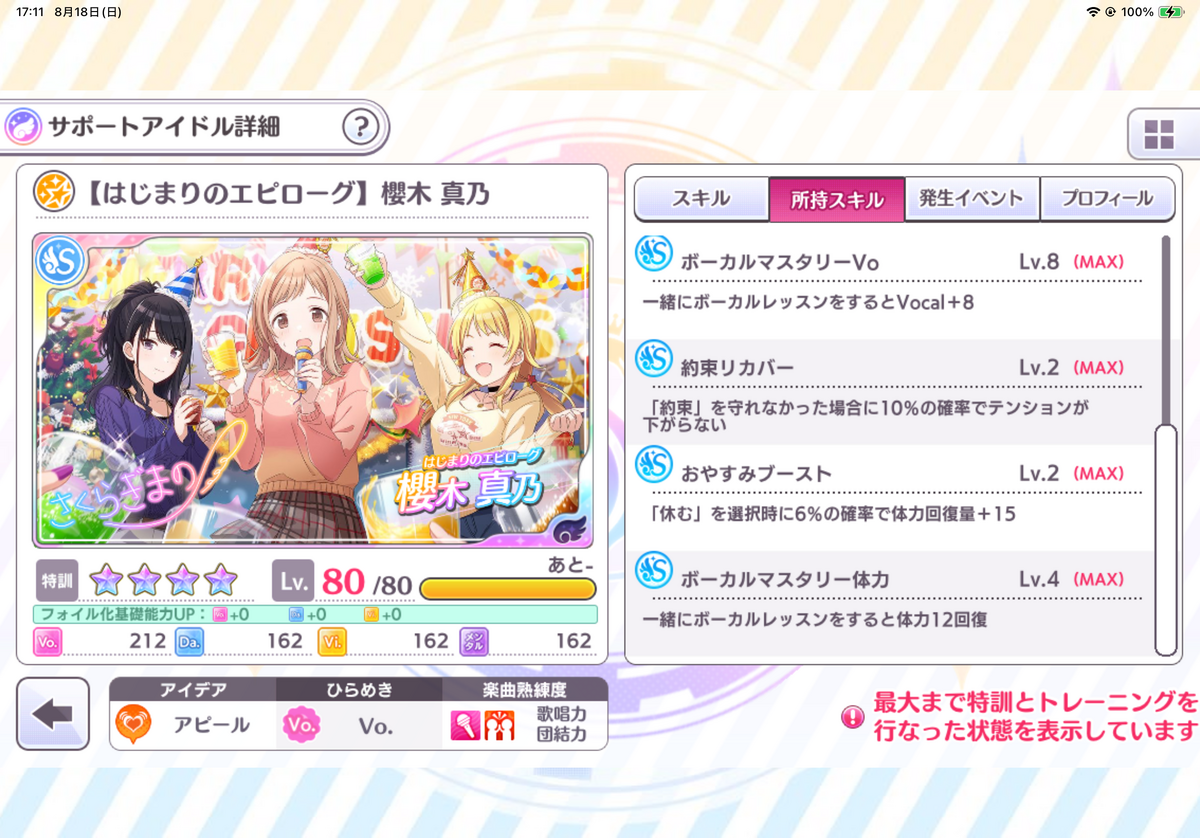 真乃の場合は「Voひらめき持ち」の「Voパネル」かつ「Voマスタリー体力持ち」でこれだけ揃っていれば文句なしです。